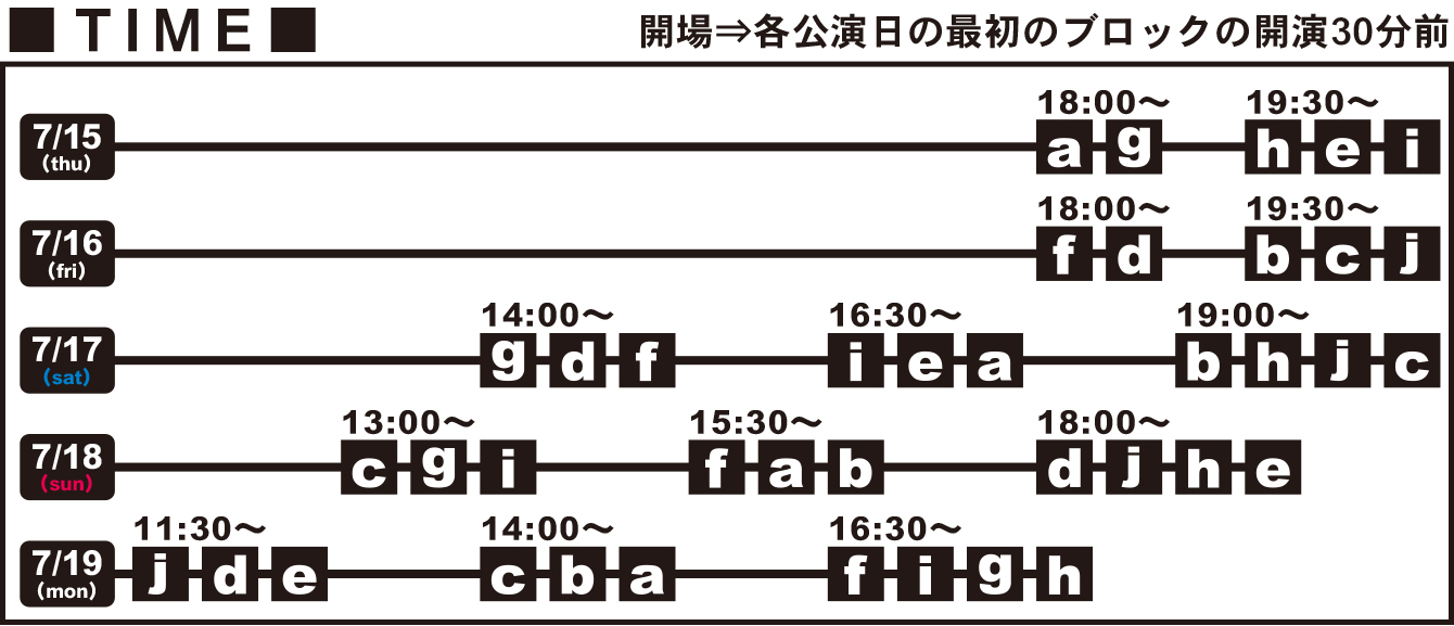 (3)上記は各ブロックの開演時間です。各日の初回のみ開演45分前受付開始、30分前開場。以降はいつでもご入場頂けます。ただし作品上演中は安全と感染防止対策の為、途中入場出来ません。