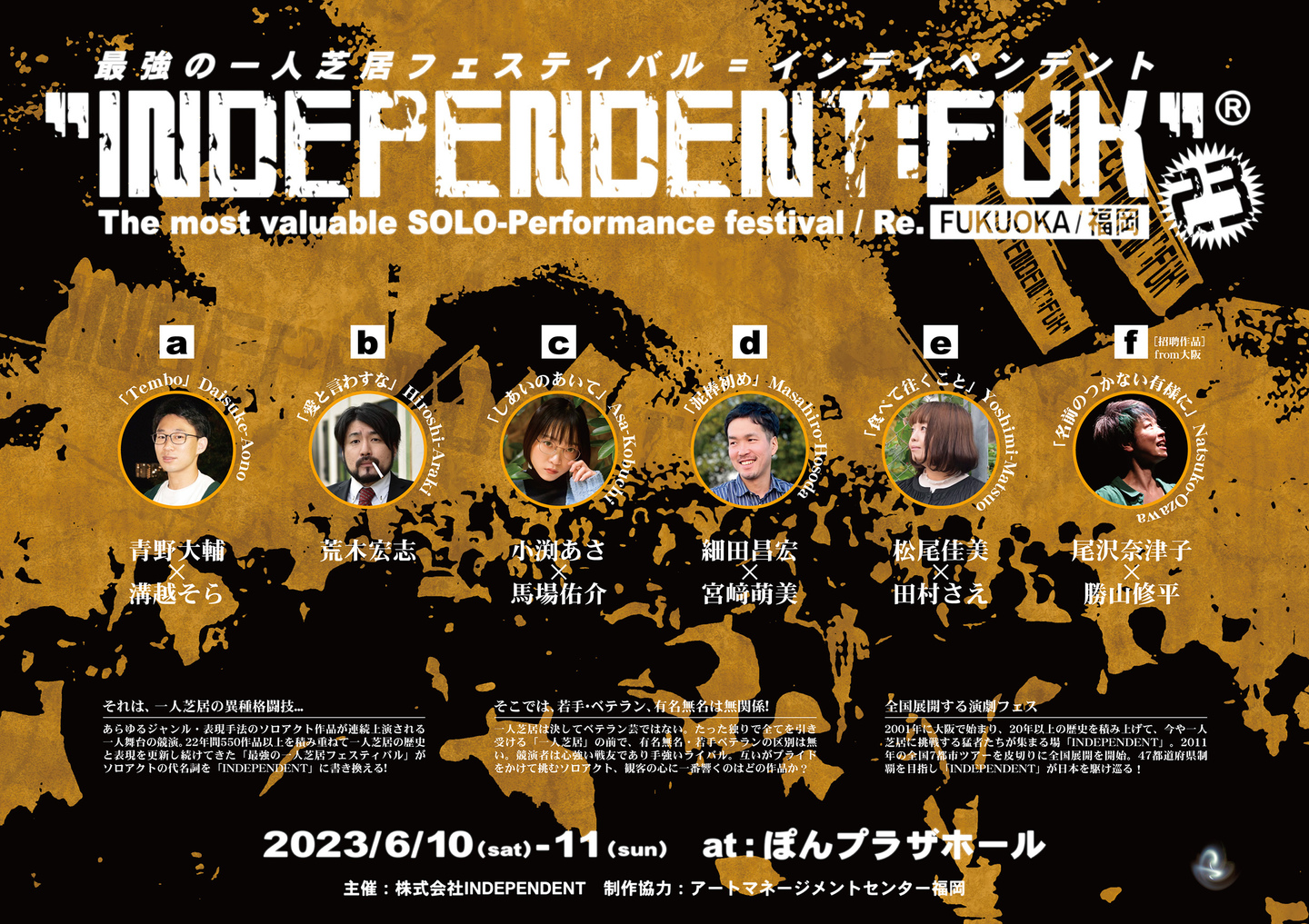 毎年、大阪・インディペンデントシアターを拠点に開催される最強の一人芝居フェスティバル「INDEPENDENT」。2011年夏に行われたジャパンツアー福岡公演を経て、2012年から九州の創り手を中心に継続開催をスタート。応募多数の選考を突破した九州の精鋭5組と本家大阪公演で好評を得た招聘1組の計6作品が熱い競演を繰り広げる!