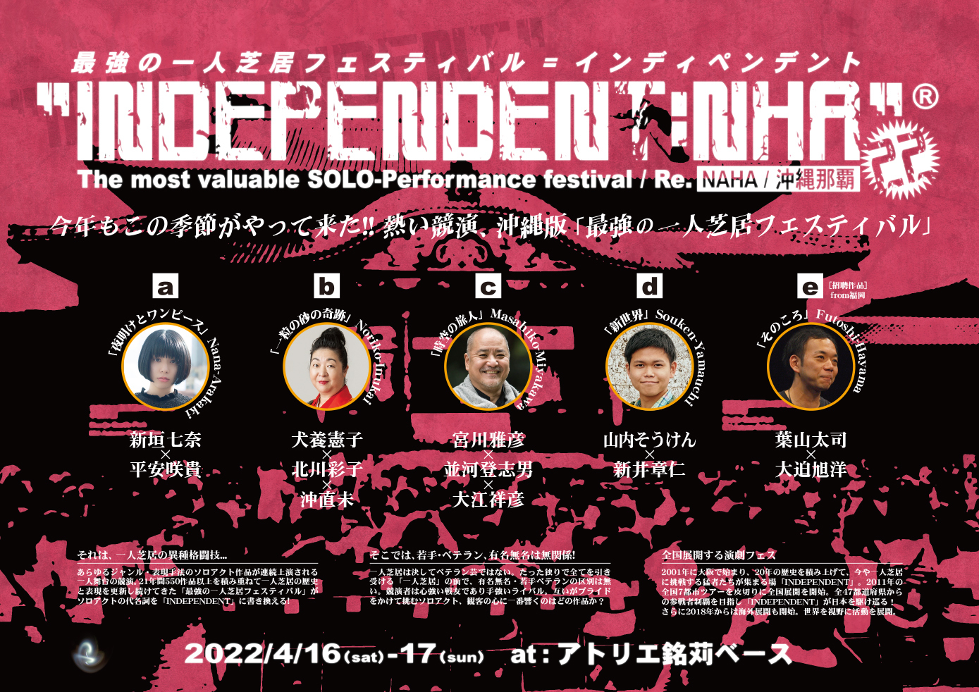 大阪発、最強の一人芝居フェスティバル「INDEPENDENT」は、2011年夏に行われたジャパンツアーの沖縄公演で初上陸し、2014年のプレ企画を経て2015年から定期開催をスタート。今年は再び地域版を開催。4組の沖縄チームと招聘1作品の5組が一人芝居の熱い競演をご覧にいれます。春を彩るフェス!是非劇場へ!