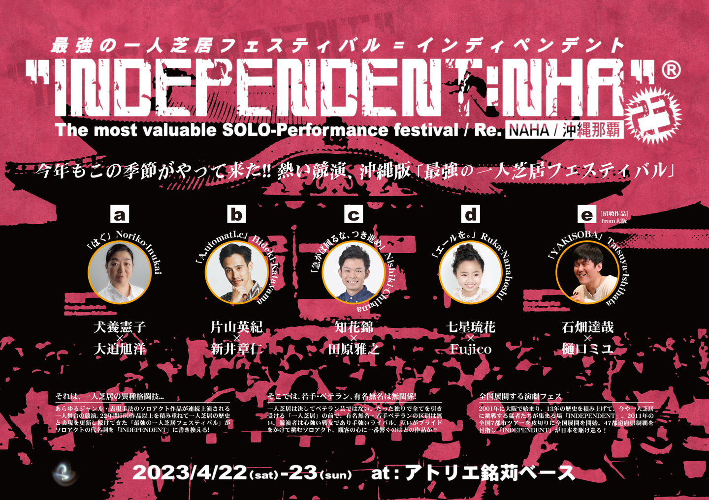 大阪発、最強の一人芝居フェスティバル「INDEPENDENT」は、2011年夏に行われたジャパンツアーの沖縄公演で初上陸し、2014年のプレ企画を経て2015年から定期開催をスタート。今年も沖縄地域版として4組の沖縄チームと招聘1作品の5組が一人芝居の熱い競演をご覧にいれます。春を彩るフェス!是非劇場へ!