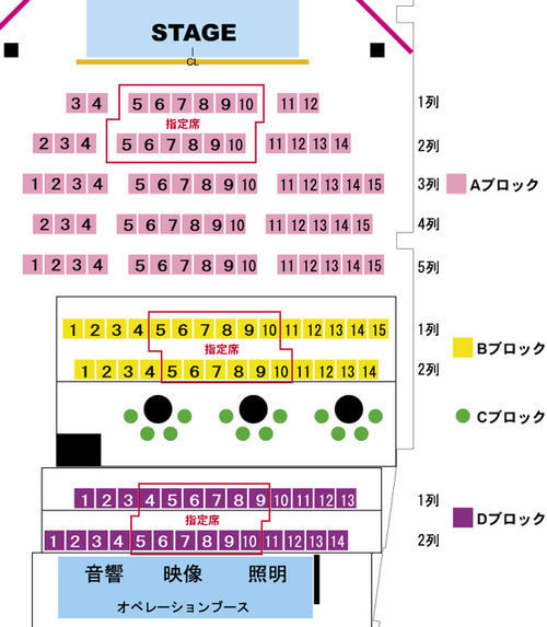 Dブロックは、大きな段差であがったまるでVIP席のようなお席です。舞台からは少し距離がありますが、圧倒的に観やすい席で人気です。中央部分が指定席となります。