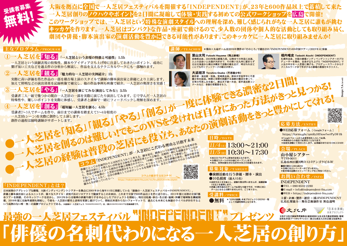 大阪を拠点に全国で一人芝居フェスティバルを開催する「INDEPENDENT」が、23年と600作品以上で蓄積して来た一人芝居創りのノウハウやポイントを2日間に凝縮して体験・実践する初めての公式ワークショップを広島で開催!