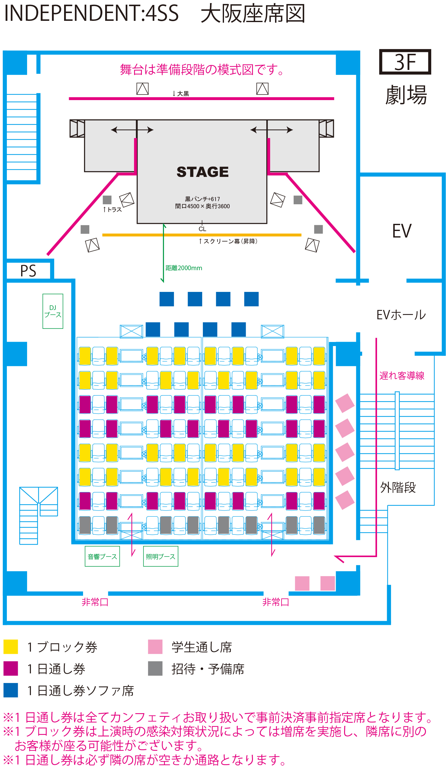 ●1ブロック券[当日指定席]予約3,000円/当日3,500円