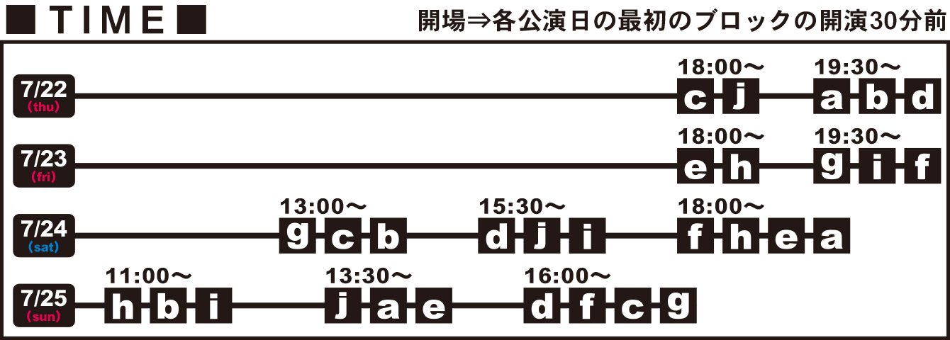 (3)上記は各ブロックの開演時間です。各日の初回のみ開演45分前受付開始、30分前開場。以降はいつでもご入場頂けます。ただし作品上演中は安全と感染防止対策の為、途中入場出来ません。