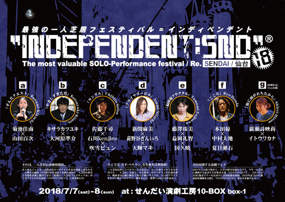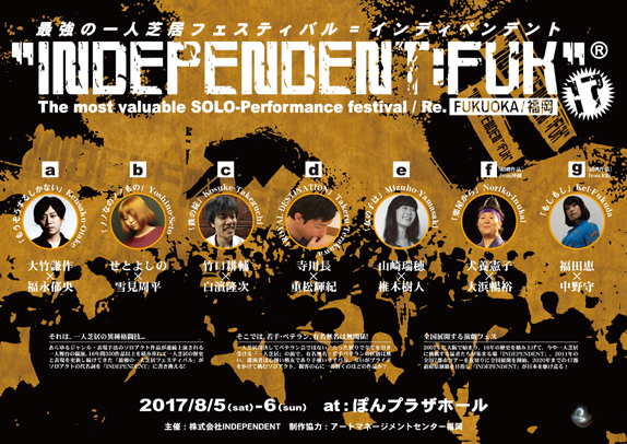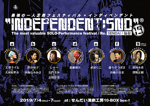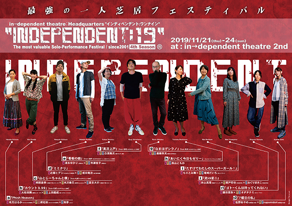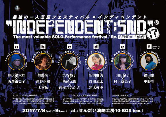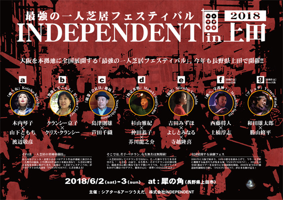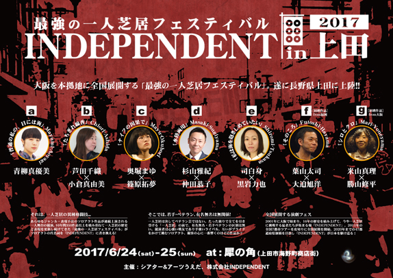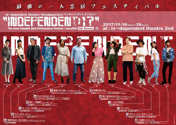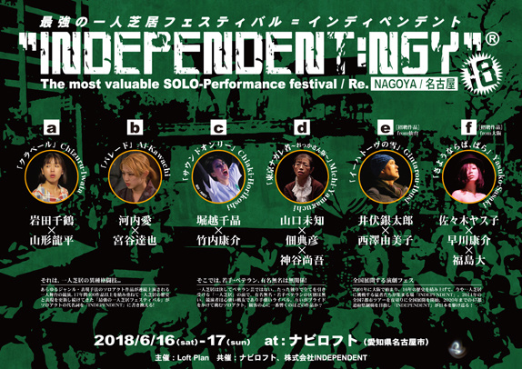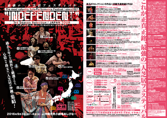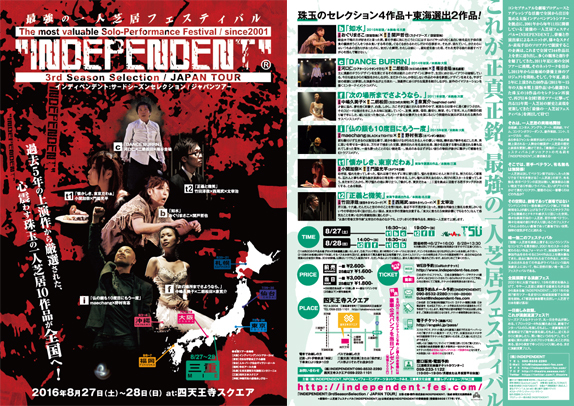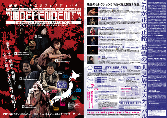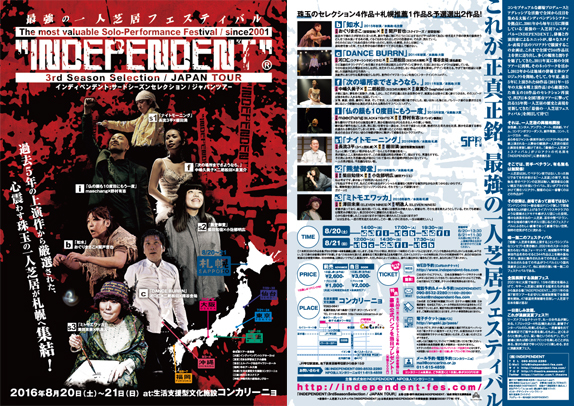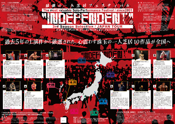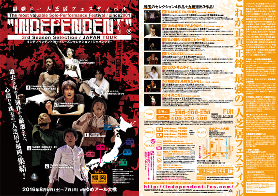「INDEPENDENT」のフライヤーは、統一感のあるデザインベースに各地域でイメージカラーを採用し、シリーズのブランドイメージを形作ると共に、地域の特色を出しています。それぞれのフライヤーはその地域でのみ配布しています。また、主に劇場などのアートスペースで配布されるため、手に入らない、他の地域のフライヤーも欲しいという方の為に、PDFでご用意しました。ご自宅のプリンターなどで印刷すればあなたのお手元に!