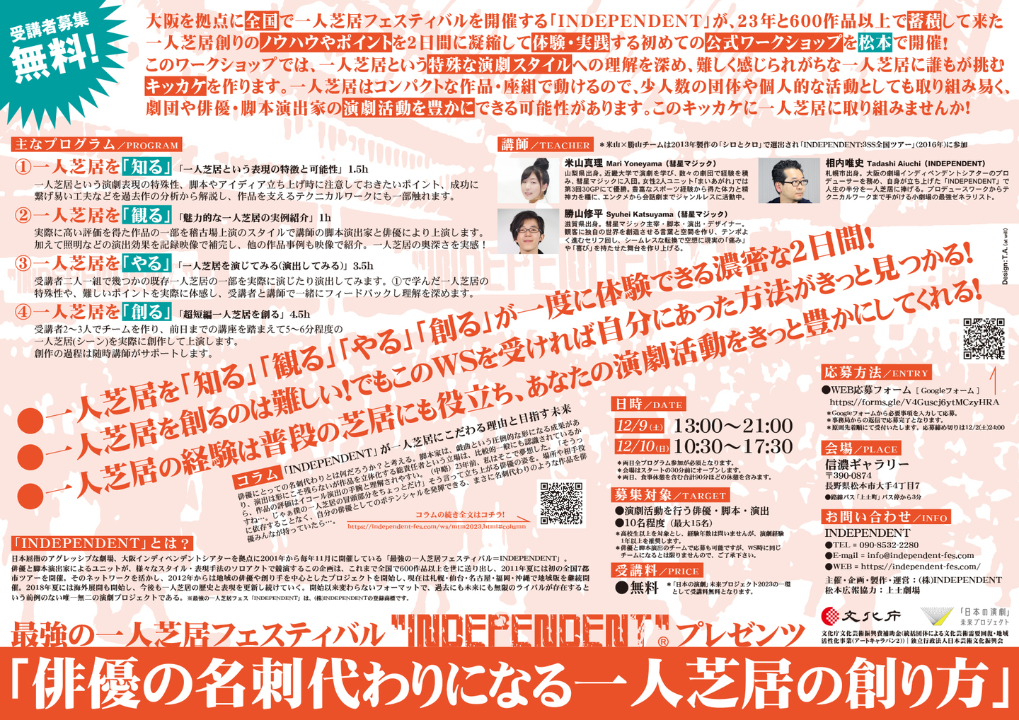 大阪を拠点に全国で一人芝居フェスティバルを開催する「INDEPENDENT」が、23年と600作品以上で蓄積して来た一人芝居創りのノウハウやポイントを2日間に凝縮して体験・実践する初めての公式ワークショップを松本で開催!