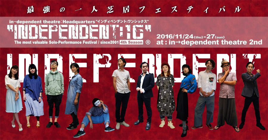 コンセプチュアルな劇場プロデュース作品とアグレッシブな活動で全国から注目を集めるインディペンデントシアターを拠点に、2001年から毎年11月に開催している「最強の一人芝居フェスティバル=INDEPENDENT」。俳優と作家演出家が、様々なジャンル・表現手法のソロアクトで競演する唯一無二のフェスティバルは、1ドリンク付きでDJが盛り上げる劇場であって劇場では無い空間。これまでフェス全体で348作品が上演され、多くの観客や創り手を魅了してきた。5年ごとに過去上演された作品から厳選した珠玉のセレクション再演企画を実施。今年夏には、二度目の全国7都市(大阪・東京・仙台・福岡・札幌・三重・沖縄)縦断ツアーを敢行。2012年からは地域主体の地域版INDEPENDENTも開始し、INDEPENDENTフォーマットは日本中に拡大を続けている…。今年11月遂に4thSeasonがスタート!。今年は若手・中堅を中心とする関西勢と夏の全国ツアーで競演した地域作品が入り乱れ、静かで熱い競演を繰り広げる。一番観客のハートに届くのはどの作品か?