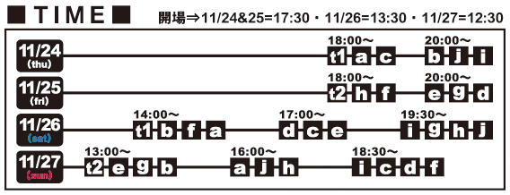 (3)上記は各ブロックの開演時間です。各日の初回のみ開演45分前受付開始、30分前開場。以降はいつでもご入場頂けます。