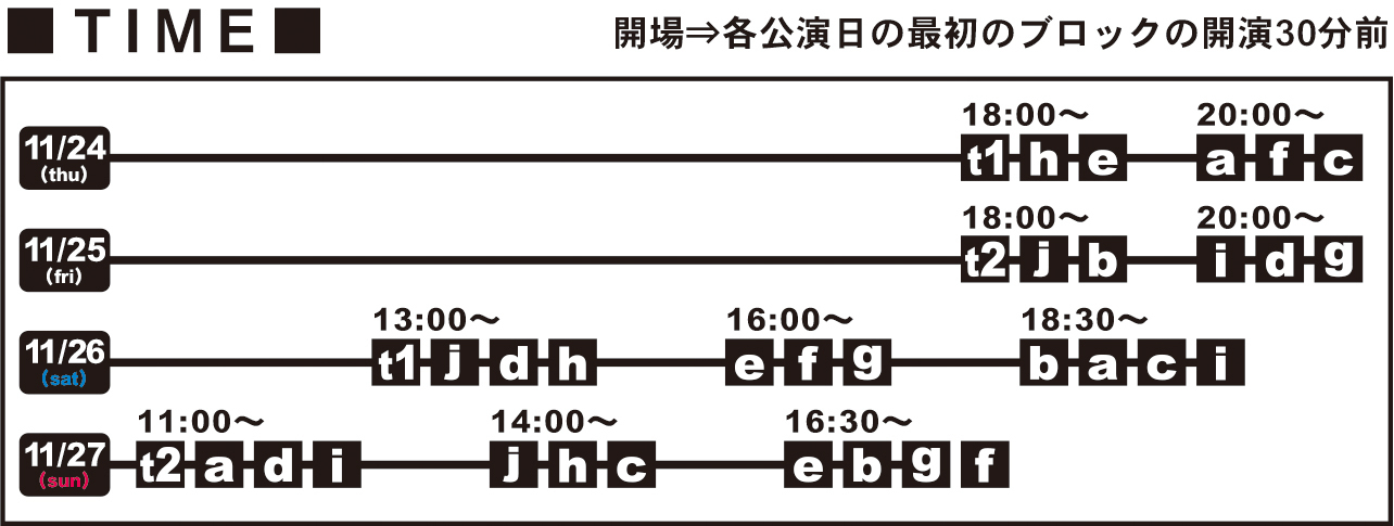 (3)上記は各ブロックの開演時間です。各日の初回のみ開演45分前受付開始、30分前開場。以降はいつでもご入場頂けます。ただし作品上演中は安全と感染防止対策の為、途中入場出来ません。