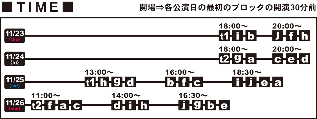 (3)上記は各ブロックの開演時間です。各日の初回のみ開演45分前受付開始、30分前開場。以降はいつでもご入場頂けます。ただし作品上演中は安全と感染防止対策の為、途中入場出来ません。