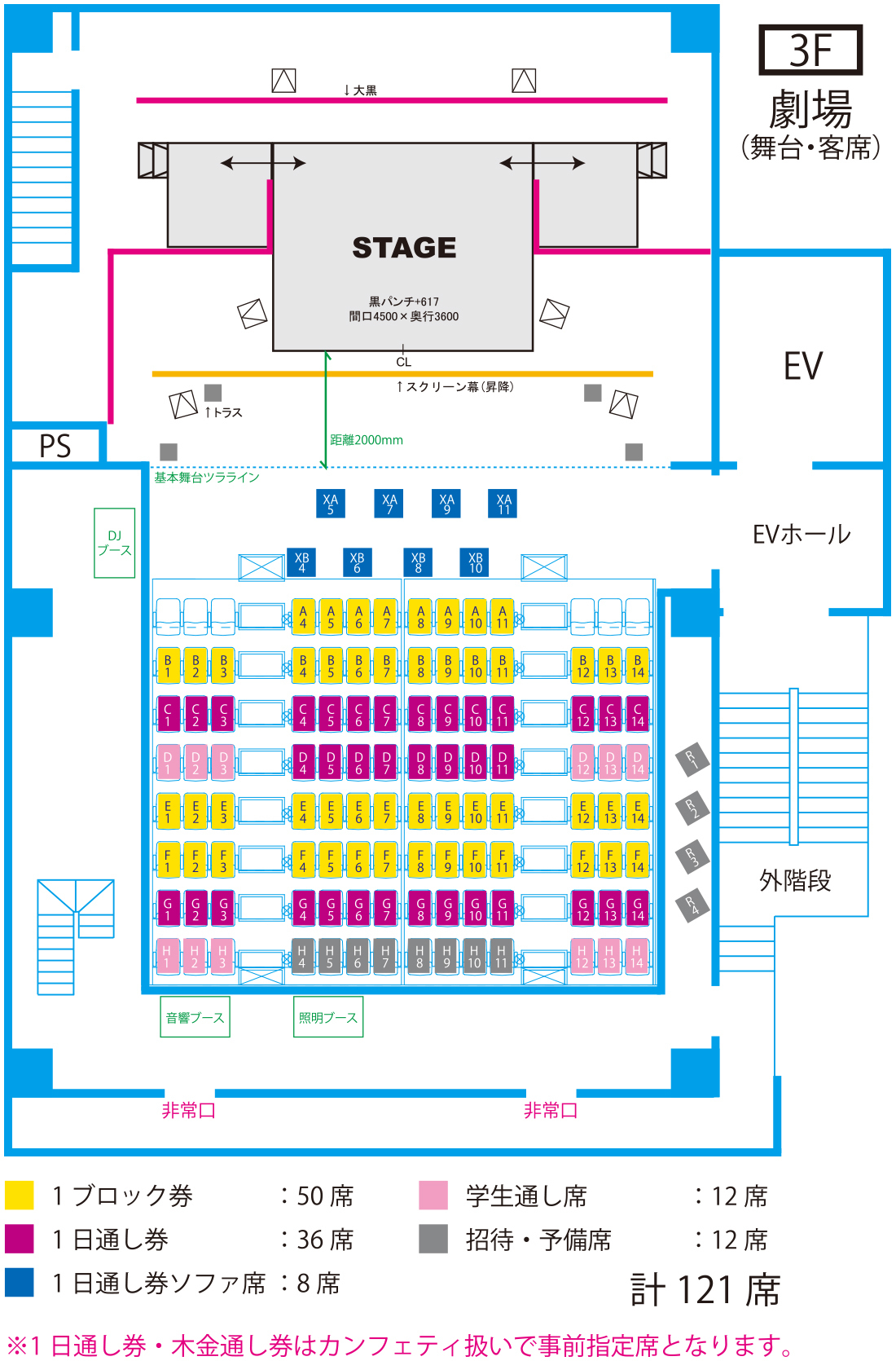 (2)各ブロック間は、約30分~1時間のインターバルとなります。劇場内のDJタイムやロビーなどでおくつろぎ下さい。1日券のお客様は、劇場を出て再入場することも可能です。
