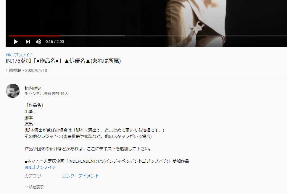 (2)撮影した動画をご自身や団体のアカウントでyoutube上に公開して下さい。投稿動画のタイトルや詳細情報は以下のように記載して下さい。