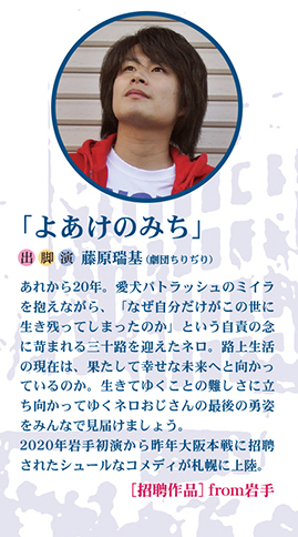 2011年の全国ツアー以来、各地で“地域版”が開催され盛り上がりを見せている大阪発“最強の一人芝居フェスティバル”。いち早く地域版としてスタートしたINDEPENDENT:SPRも9回目。今回はシアターZOOに会場を移し、これまで最大の開催日数でお届け!本家大阪公演で好評を得た招聘2組を道内勢4作品が迎え撃ちます。SPRからは多くの作品が本家大阪に招聘参戦を果たすなど、他地域進出のきっかけを作ってました。次に続くのは誰だ!